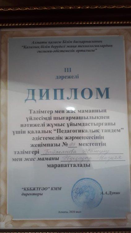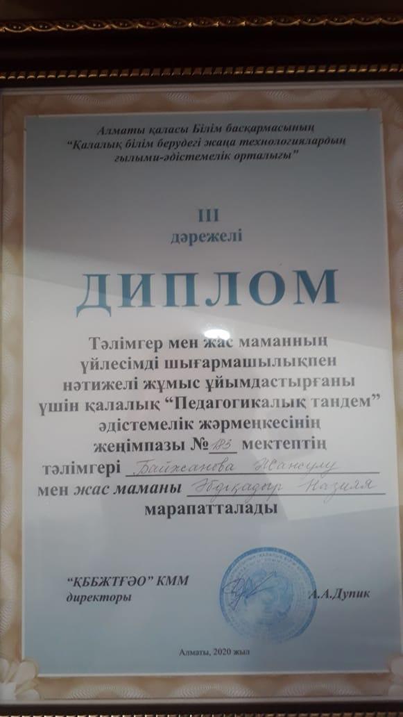 Қалалық тәлімгер мен жас маманның үйлесімді шығармашылық пен нәтижелі жұмыс ұйымдастырғаны үшін "Педагогикалық тандем" әдістемелік жәрмеңкесінің жеңімпазы Тәлімгер Байжанова Жансулу мен Жас маман Әбдіқадыр Назиля 3-дәрежелі дипломмен марапатталды.