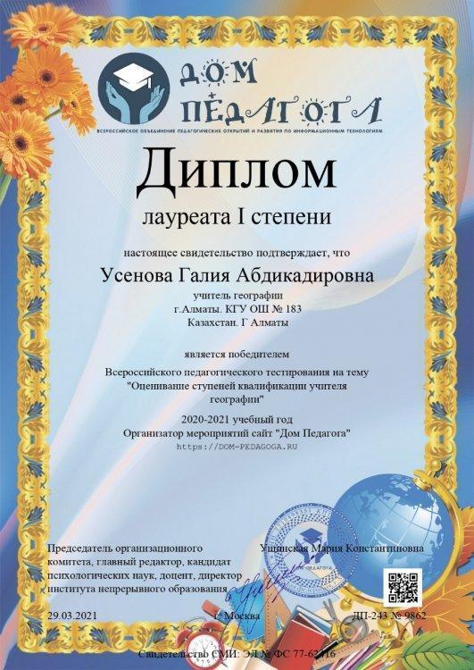 Гегография пәнінің мұғалімі Усенова Г.А. жетістіктері