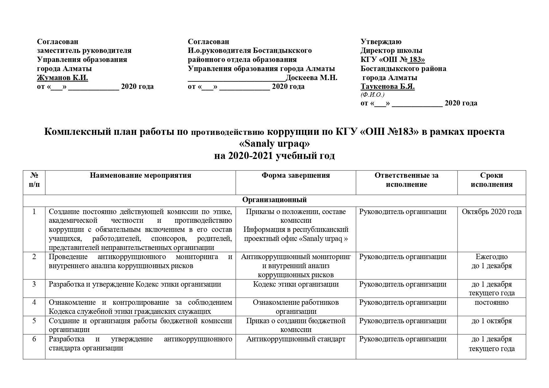 14 желтоқсан 2020 0 1 2 3 4 5 Комплексный план работы по противодействию коррупции по КГУ «ОШ №183» в рамках проекта «Sanaly urpaq» на 2020-2021 учебный год Осы беттің QR-коды:QR-код этой страницы: